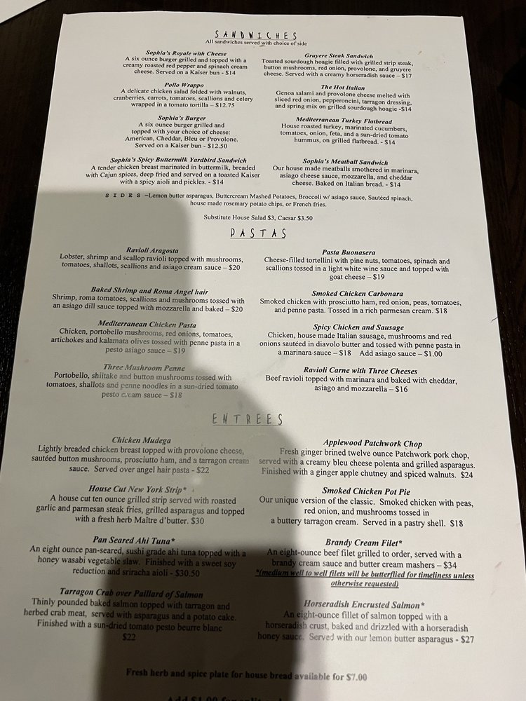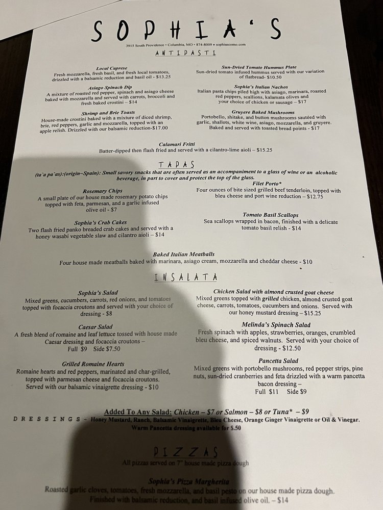 Located in Columbia, MO, Sophia's offers a mix of New American and Italian cuisine in a classy yet casual environment. With options for outdoor seating, delivery, and catering, Sophia's caters to a variety of dining preferences. Reviewers rave about the flavorful dishes, such as the Horseradish Encrusted Salmon and Smoked Chicken Pot Pie. The attentive service, extensive cocktail menu, and fresh pasta dishes are also highly praised by patrons. Whether you're looking for a quiet dinner or a lively brunch experience, Sophia's ambiance and delicious food make it a top choice in the area. Don't miss out on trying their homemade meatballs, Caesar salad, and decadent desserts. With a constant flow of satisfied customers, Sophia's is a must-visit destination for a memorable dining experience.